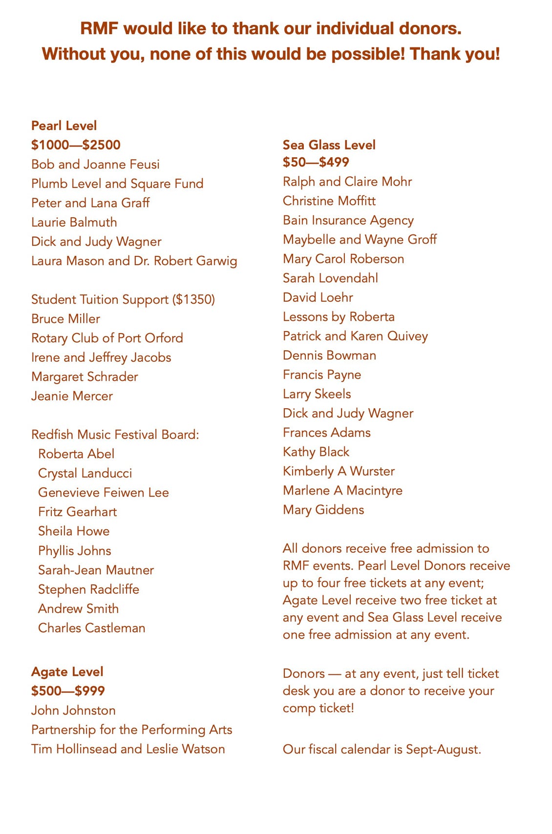 We appreciate any amount you choose to give – all donations (minus credit card fees) go directly to help Redfish’s operating costs. All donors receive free admission to RMF events. Pearl Level Donors ($1000-$2500) receive up to four free tickets at any event; Agate Level ($500-$999) receive two free ticket at any event and Sea Glass Level ($50-$499) receive one free admission at any event.