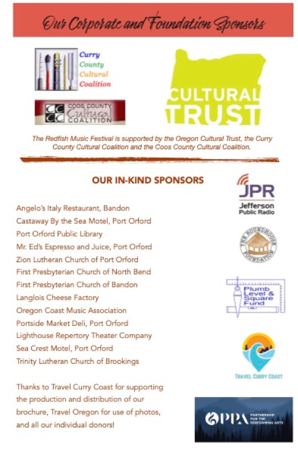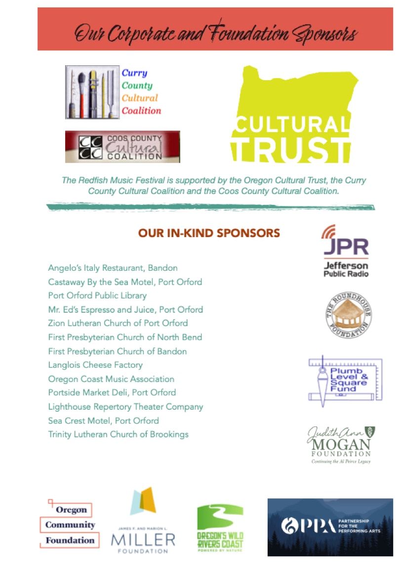 Keep the torch alive for classical music on the coast! Become a Concert Sponsor for $2500. Your name will be featured (if you choose) on all advertising related to the concert you support. Another option is to become our Season Sponsor for a donation of $7500 or more.
